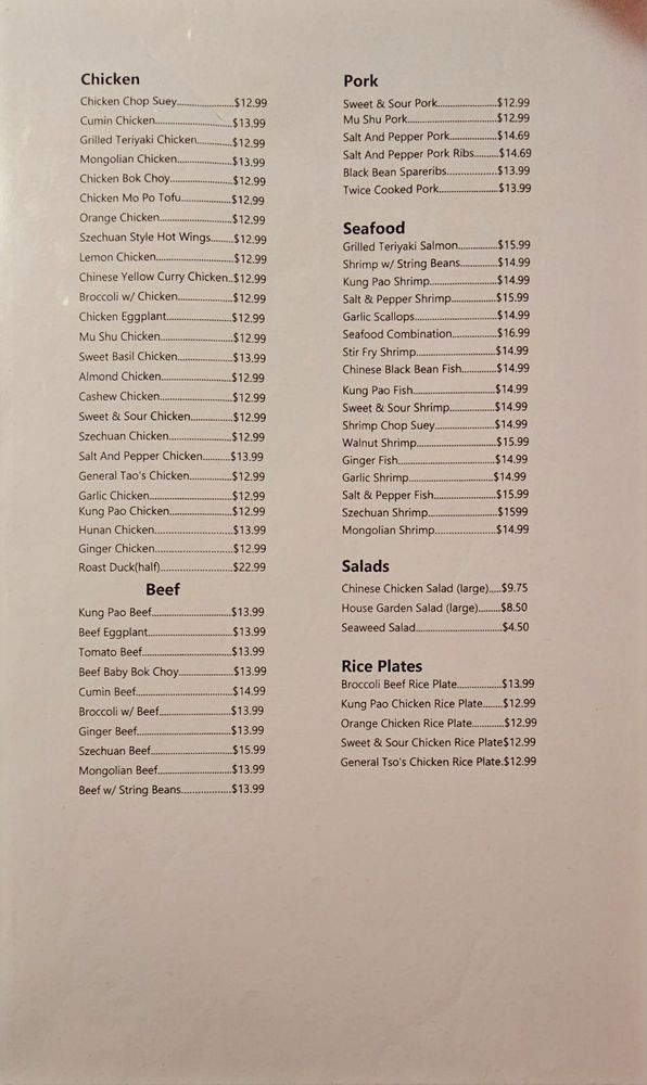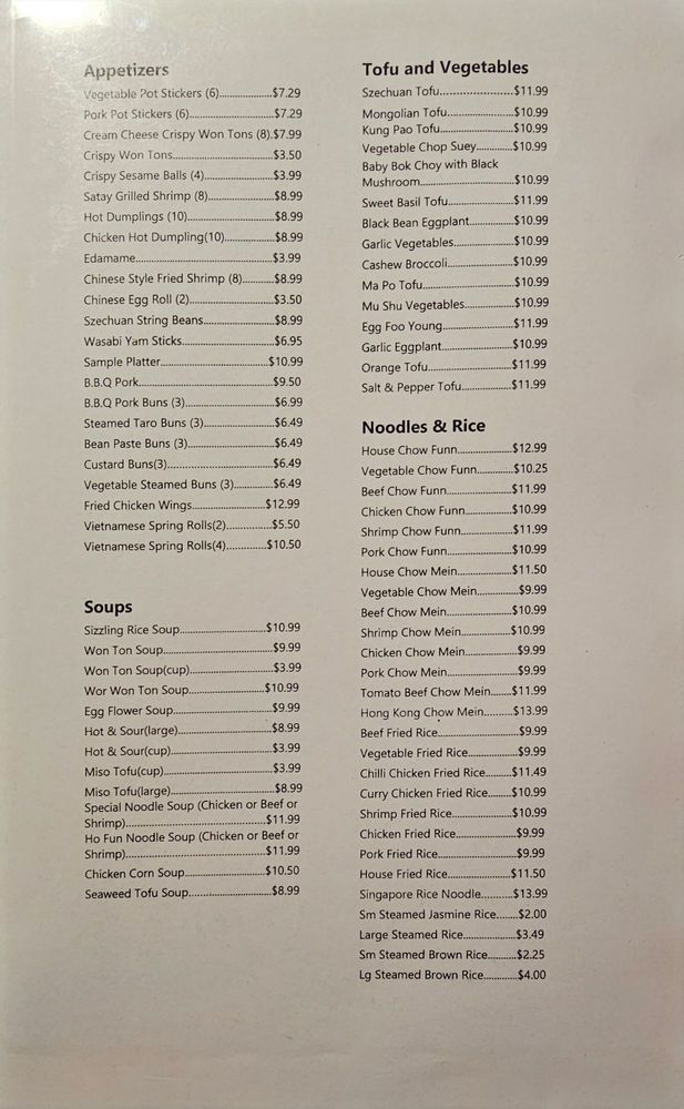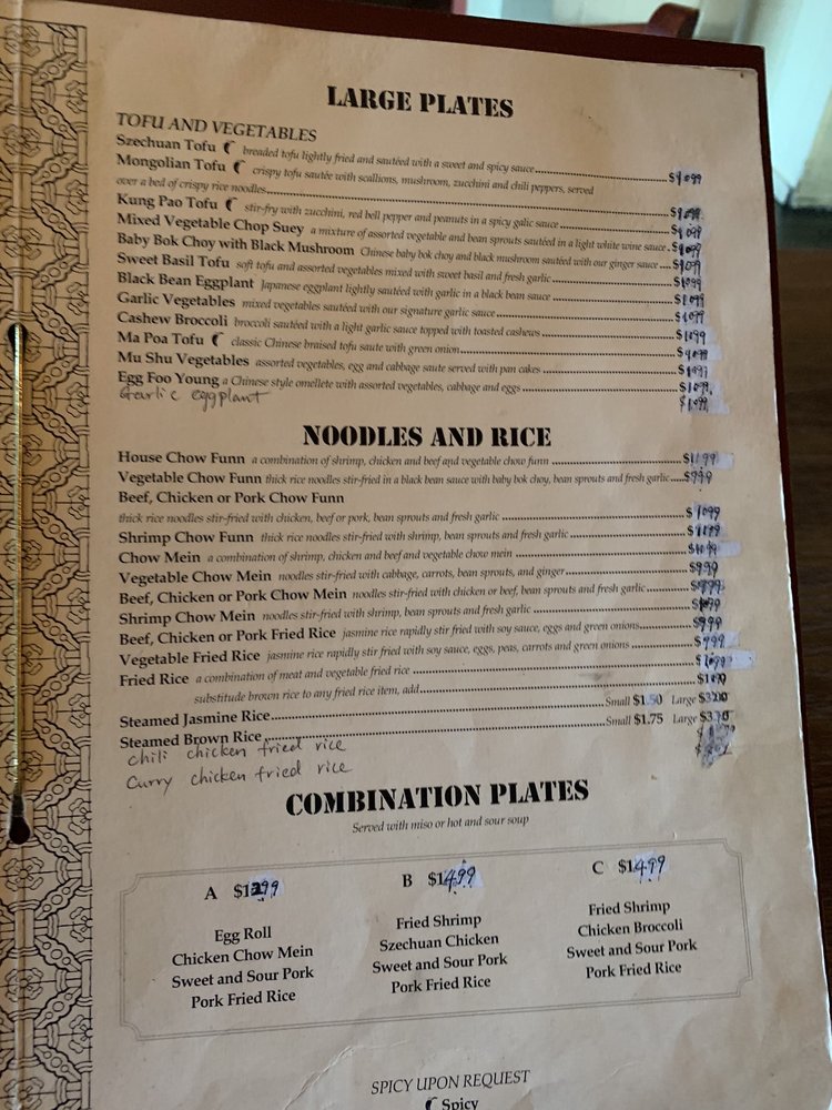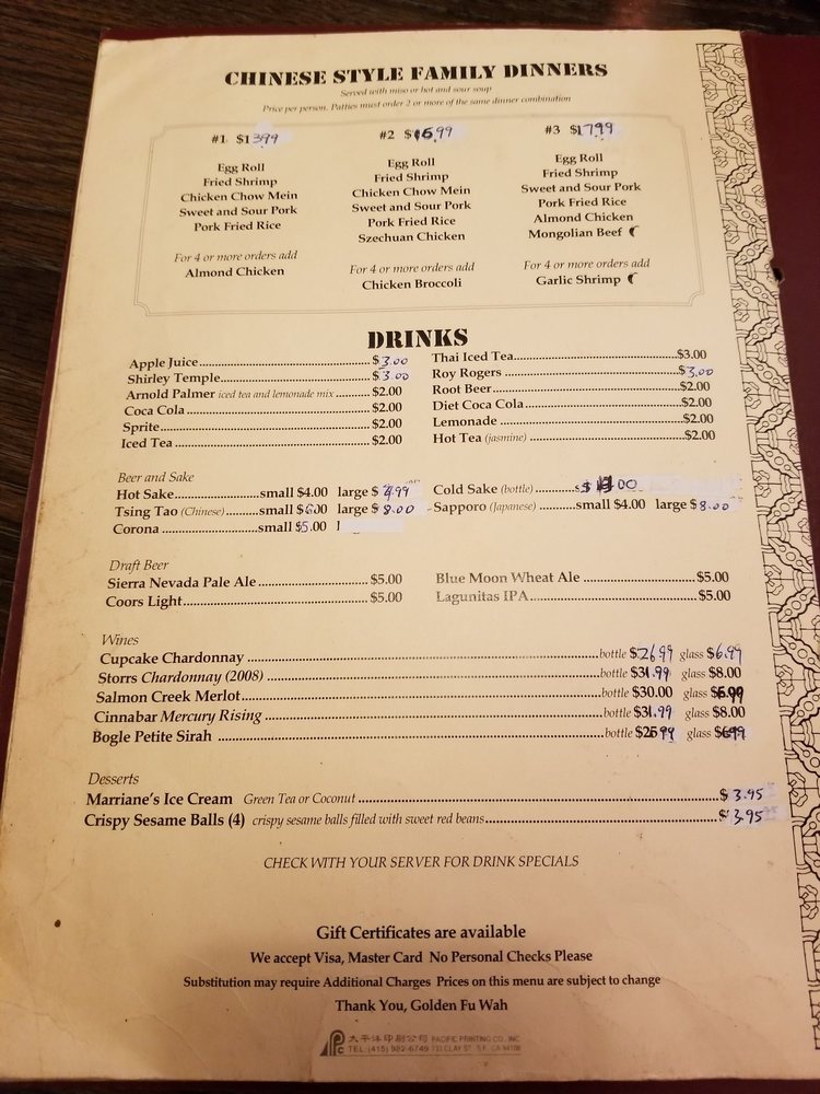 Introducing the menu at Golden Fu Wah, a Chinese-Asian Fusion restaurant in Soquel, CA, known for its diverse offerings. From Chinese Style Family Dinners featuring classic dishes like Egg roll and sweet and sour pork to mouth-watering options like Szechuan Tofu and Cashew Broccoli for vegetarians, the menu caters to everyone. The Noodles and Rice section boasts Chicken Chow Mein and Pork Fried Rice made with BBQ pork for a satisfying meal. Customer reviews rave about the flavorful dishes and quick service, with highlights including the Szechuan string beans and BBQ pork Buns. The cozy atmosphere and friendly staff add to the overall dining experience. Golden Fu Wah truly stands out for its delicious Chinese cuisine and welcoming ambiance.