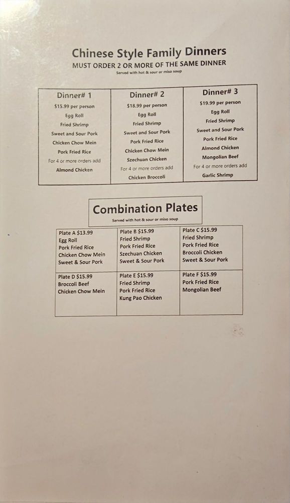 Egg roll, fried shrimp, chicken chow mein, sweet, and sour pork, pork fried rice, Szechuan chicken. For 4 or more orders add chicken broccoli.